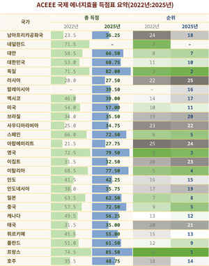 [에너지신문] 미국의 비영리단체 에너지효율경제위원회(ACEEE)가 전세계 에너지 소비량의 83%를 차지하는 25개 주요 국가를 대상으로 에너지효율 정책과 성과를 평가한 결과, 대한민국은 총점 100점 만점에 60.75점을 획득, 2022년 11위에서 한 단계 상승한 10위를 기록했다.기후변화행동연구소는 31일 미국 ACEEE의 ‘2025 국제 에너지효율 득점표’ 보고서를 분석했다. 대한민국은 총점 60.75점을 획득, 10위에 올랐다. 이는 2022년 53.0점에서 7.75점 상승한 결과로, 평가 대상국 중 상위권에 진입한 것이다.