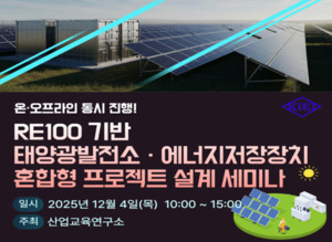 [에너지신문] 탄소중립 시대를 맞아 RE100 달성을 위한 에너지 전환 전략이 기업 경쟁력의 핵심 요소로 떠오르고 있다.태양광발전과 에너지저장장치(ESS)를 융합한 최신 에너지 솔루션을 중심으로 기업의 탄소중립 실현과 새로운 비즈니스 기회 발굴에 대한 중요성이 커지고 있다. 이러한 시기에 산업교육연구소는 12월 4일에 ‘RE100 기반 태양광발전소ㆍ에너지저장장치 혼합형 프로젝트 설계 세미나’를 온·오프라인 동시 개최한다고 25일 밝혔다.이번 세미나에서는 글로벌 RE100 환경 변화가 기업에 미치는 영향 및 정부의 탄소중립 정책과 지