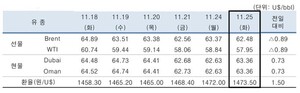 [에너지신문] 25일 국제유가는 우크라이나 종전 협정 타결 가능성 고조, 2026년 원유 공급 과잉 심화 전망으로 하락했다. 한국석유공사는 서부 텍사스산 원유인 WTI가 전일대비 배럴당 0.89달러 하락한 57.95달러에, 북해산 Brent유는 0.89달러 하락한 62.48달러에 각각 마감했다고 밝혔다. 반면 국내 기준 유가로 적용되는 중동산 Dubai유는 전일대비 배럴당 0.73달러 상승한 63.36달러에 마감됐다. 미국의 외교적 압력으로 우크라이나 종전 협정 타결이 임박했다. 우크라이나 국가 안보 책임자(Rustem Umerov