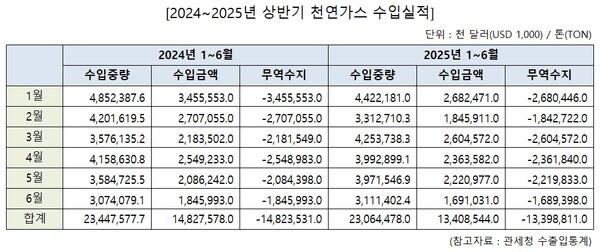 최근 관세청이 집계한 상반기 천연가스 수입실적에 따르면 올해 상반기 천연가스 총 수입중량은 2306만 4478톤으로 수입액은 133억 9881만달러에 달했다. 지난해 상반기 천연가스 총 수입중량은 2344만 7577톤, 수입액은 148억 2757만달러였다. 수입량과 수입액이 소폭 감소하긴했지만 수입량과 수입액 모두 비슷한 수준을 유지하면서 안정적 공급이 이뤄진 것으로 분석된다.