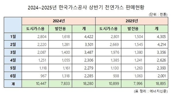 올해 상반기(1~6월) 한국가스공사의 천연가스 판매 실적(공시)에 따르면 도시가스용 1089만 9000톤, 발전용 799만 6000톤으로 총 1889만 5000톤으로 집계됐다. 지난해 상반기에는 도시가스용 1044만 7000톤, 발전용 783만 3000톤으로 총 1828만톤을 판매했었다. 이는 올해 상반기 전년동기대비 도시가스용은 5%, 발전용 2.1%가 증가해 전체 천연가스 판매량은 3.7% 증가하면서 전년과 비슷한 수준의 판매량을 기록했다는 것을 의미한다.