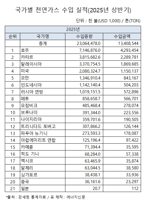 국가별 수입실적을 보면 호주가 714만여톤으로 가장 많았고, 카타르 381만톤, 말레이시아 337만톤, 미국 208만톤, 오만 134만톤, 인도네시아 114만톤 순이다.