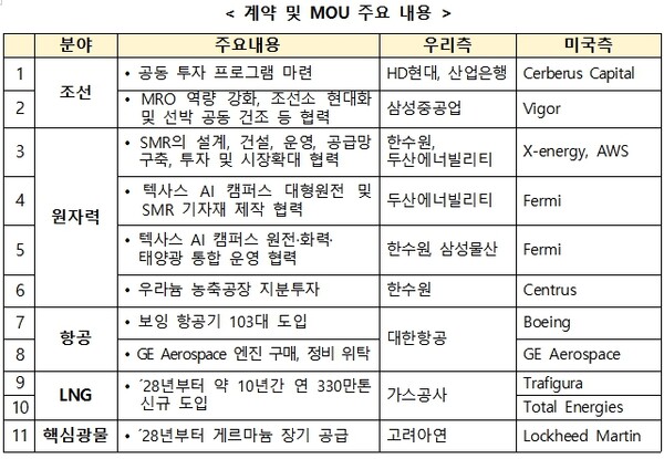 특히 조선, 원자력 등 전략 산업 분야에서 양국간 협력을 확대하기 위한 공동 펀드 조성, 투자, 기술 협력을 내용으로 하는 MOU가 6건 체결됐다. 항공, LNG 분야에서는 우리 기업의 안정적인 사업 운영을 위한 계약 및 MOU 4건, 공급망 분야에서는 우리 기업의 핵심 희소금속 대미 수출을 위한 MOU가 체결됐다.