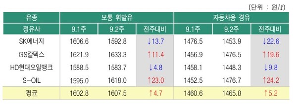 주유소 판매가격에 비해 가격조사가 한주 늦은 9월2주 정유사의 석유제품 공급가격은 휘발유가 전주대비 리터당 4.7원 상승한 1607.5원, 경유는 5.2원 오른 1465.8원, 실내등유는 40.2원 오른 1011.1원을 나타냈다.