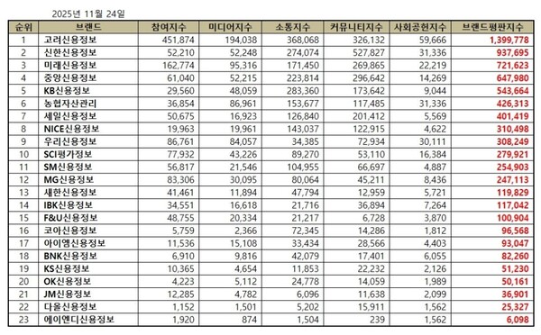 4위, 중앙신용정보 브랜드는 참여지수 61,040 미디어지수 52,215 소통지수 223,814 커뮤니티지수 296,642 사회공헌지수 14,269가 되면서 브랜드평판지수 647,980으로 분석됐다. 지난 10월 브랜드평판지수 1,001,292와 비교해보면 35.29% 하락했다.