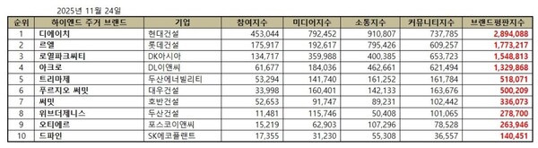 한국기업평판연구소는 10개 하이엔드 주거 브랜드에 대해 2025년 10월 24일부터 2025년 11월 24일까지의 국내 하이엔드 주거 브랜드 빅데이터 9,583,436개를 분석한 결과 지난 10월 하이엔드 주거 브랜드 빅데이터 10,088,618개와 비교하면 5.01% 줄어들었다고 밝혔다.