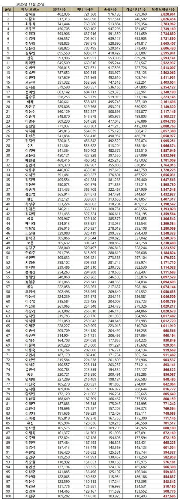 한국기업평판연구소는 2025년 10월 25일부터 2025년 11월 25일까지 방영한 드라마, 영화, OTT에서 출연중인 배우 100명의 브랜드 빅데이터 141,335,073개를 소비자들의 브랜드 참여량, 미디어량, 소통량, 커뮤니티량으로 측정하여 브랜드평판 알고리즘으로 지수화한 결과 지난 11월 배우 브랜드 빅데이터 186,695,012개와 비교하면 24.30% 줄어들었다고 밝혔다.