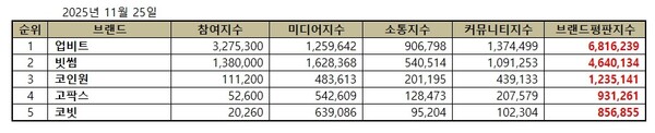 가상화폐거래소 2025년 11월 브랜드평판 순위는 업비트, 빗썸, 코인원, 고팍스, 코빗 순이었다.