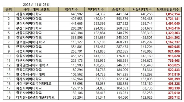 2025년 11월 사이버대학교 브랜드평판 순위는 서울사이버대학교, 경희사이버대학교, 고려사이버대학교, 부산디지털대학교, 서울디지털대학교, 건양사이버대학교, 글로벌사이버대학교, 한양사이버대학교, 세종사이버대학교, 숭실사이버대학교, 대구사이버대학교, 한국열린사이버대학교, 원광디지털대학교, 한국복지사이버대학, 국제사이버대학교, 사이버한국외국어대학교, 화신사이버대학교, 영진사이버대학교, 디지털서울문화예술대학교 순으로 분석됐다.