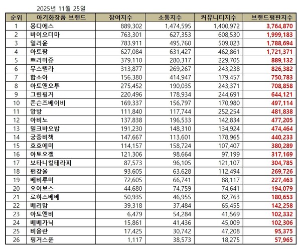 2025년 11월 아기화장품 브랜드평판 순위는 몽디에스, 바이오더마, 일리윤, 아토팜, 쁘리마쥬, 무스텔라, 함소아, 아토앤오투, 그린핑거, 존슨즈베이비, 앙방, 아비노, 밀크바오밥, 궁중비책, 호호에미, 아토오겔, 보타니컬테라피, 편강율, 베비루미, 오이보스, 로하스베베, 베리맘, 아토엔비, 베베가닉, 비올란, 핑거스푼 아기화장품 순으로 분석됐다.