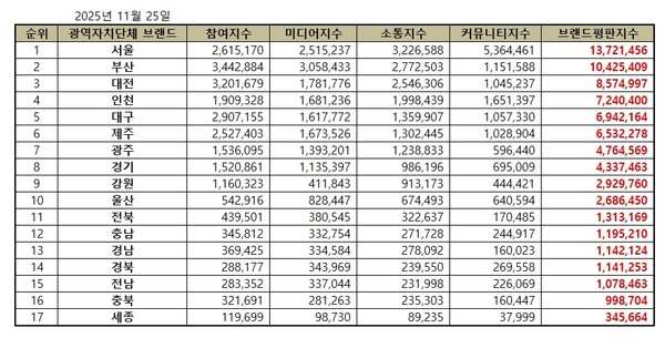 2025년 11월 대한민국 광역자치단체 브랜드평판 순위는 서울, 부산, 대전, 인천, 대구, 제주, 광주, 경기, 강원, 울산, 전북, 충남, 경남, 경북, 전남, 충북, 세종 순으로 분석됐다.