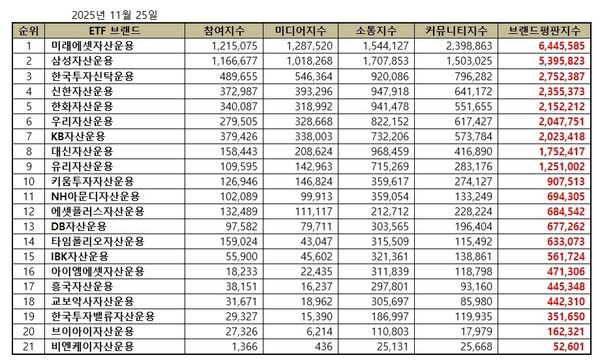 2025년 11월 ETF 발행기업 브랜드평판 빅데이터 분석 순위는 미래에셋자산운용, 삼성자산운용, 한국투자신탁운용, 신한자산운용, 한화자산운용, 우리자산운용, KB자산운용, 대신자산운용, 유리자산운용, 키움투자자산운용, NH아문디자산운용, 에셋플러스자산운용, DB자산운용, 타임폴리오자산운용, IBK자산운용, 아이엠에셋자산운용, 흥국자산운용, 교보악사자산운용, 한국투자밸류자산운용, 브이아이자산운용, 비엔케이자산운용 순이었다.
